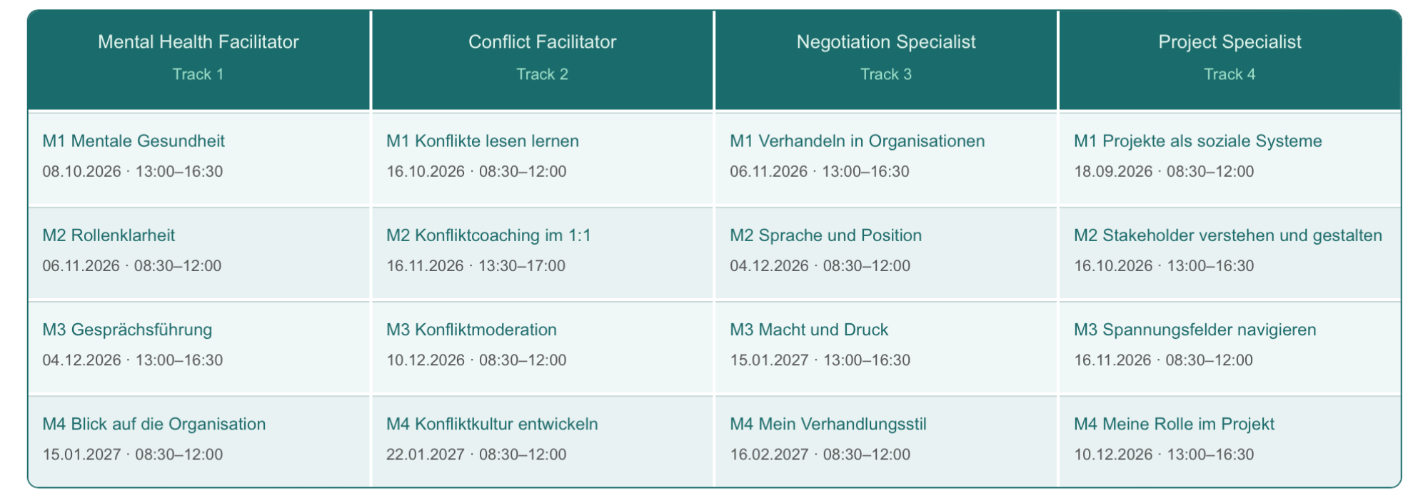Sie möchten ein Thema vertiefen oder zwei verwandte Aspekte kombinieren. Module sind frei wählbar, auch aus verschiedenen Tracks.